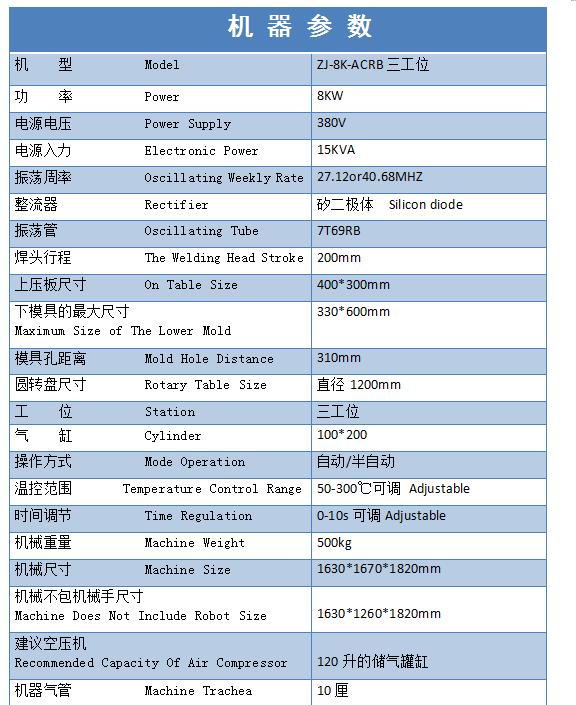 此機裝有高敏度5557防火花保護裝置,可以把模具發生火花的機率降低95%,對高周波模具和產品起到很大的保護作用。這臺機器可以單人操作,節約人工成本。它由振嘉機械設備有限公司專業制造,機器質量已通過歐盟CE質量出口檢測和ISO9001機器質量檢測;